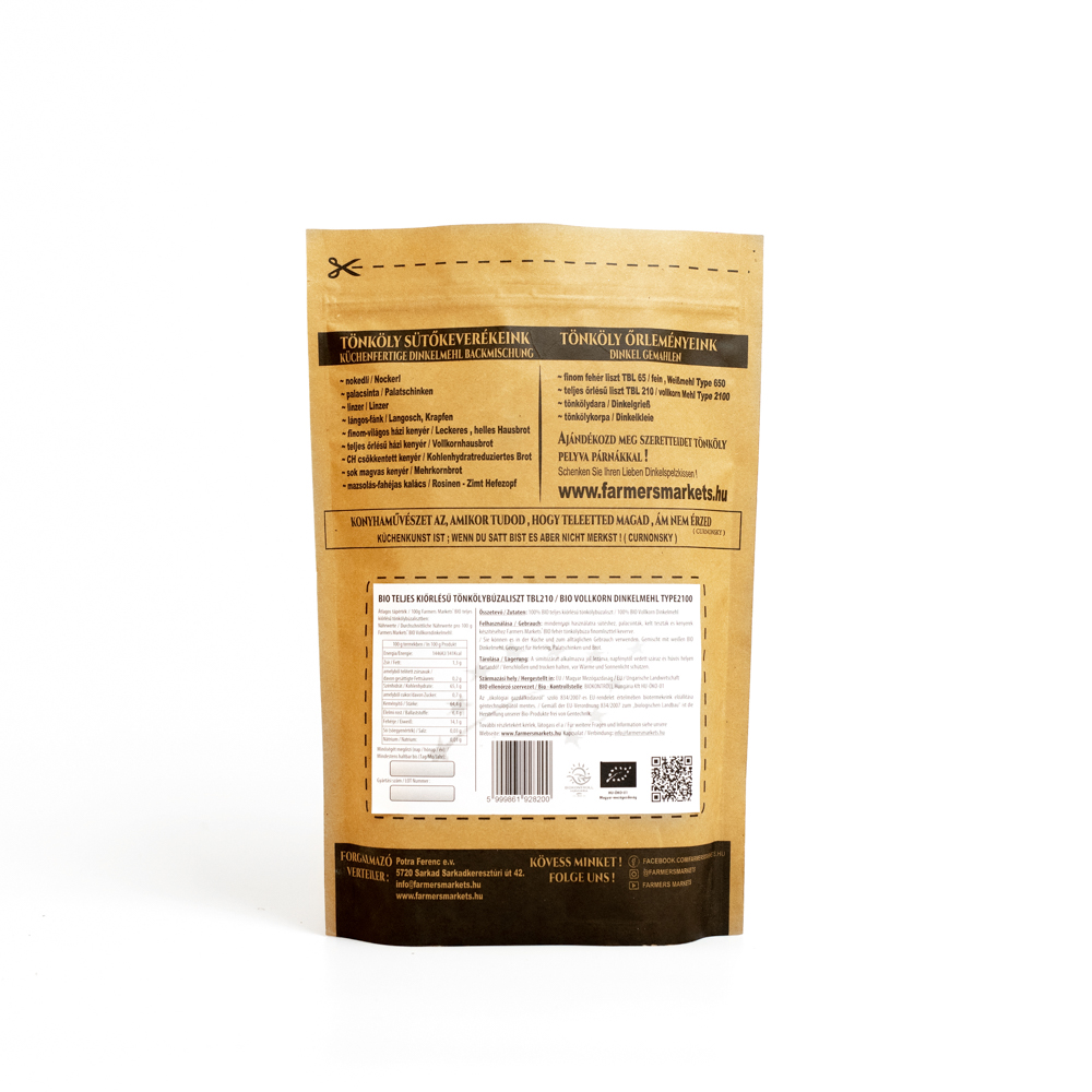 Ellenőrzött mezőgazdasági termesztésből származó, adalékmentes, teljes kiőrlésű bio tönkölybúzát tartalmaz a Farmers Markets® teljes kiőrlésű bio tönkölybúzaliszt. A termék kézműves csomagolású.